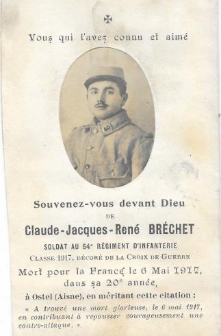 " A trouvé une mort glorieuse, le 06/05/1917, en contribuant à repousser courageusement une contre-attaque "
