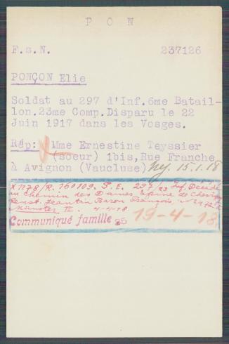Circonstances du décès : porté disparu du côté du Boyau du Pilori à la suite du violent assaut allemand du 22 juin 1917, présumé prisonnier, décès fixé au jour dit par le tribunal de Montélimar