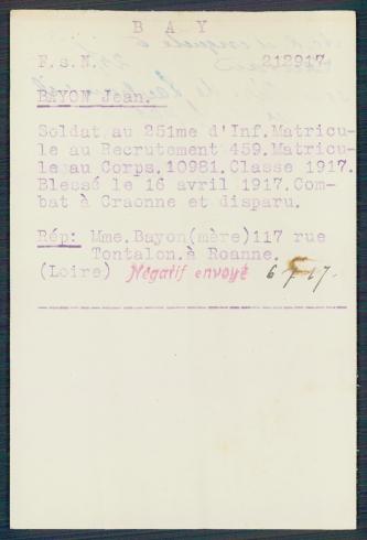 incorporé au 58e RI le 08/01/1916 ; passé au 251 RI le 21/03/1917