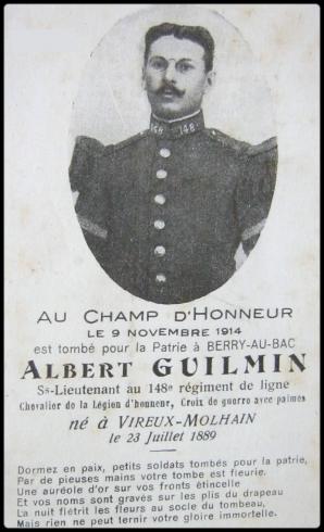 " Excellent officier d'une superbe bravoure est glorieusement tombé pour la France le 09/11/1914 a Berry au Bac en entrainant sa section a l'assaut "