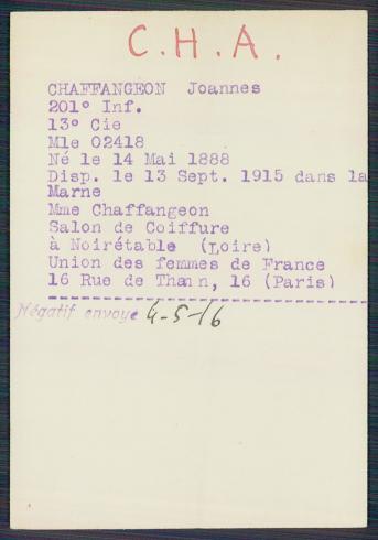 rappelé au 16e RI le 03/08/1914 ; passé au 201e RI le 01/07/1915