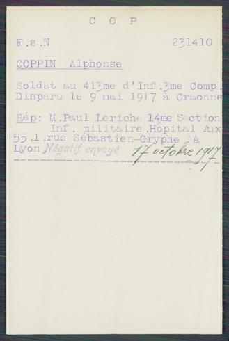 rappelé au 75e RI le 03/08/1914 ; passé au 414e RI le 16/09/1915 ; passé au 413e RI le 21/01/1917