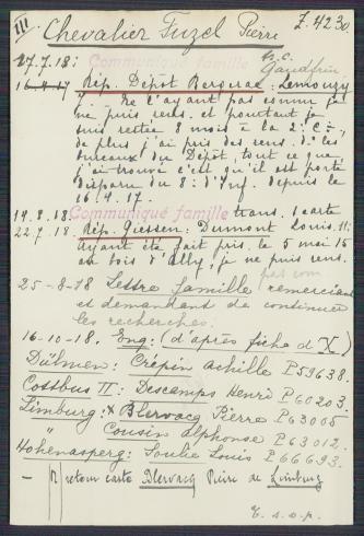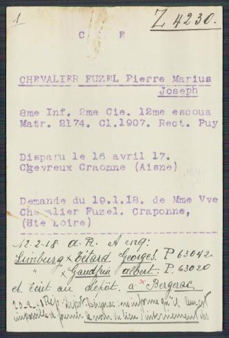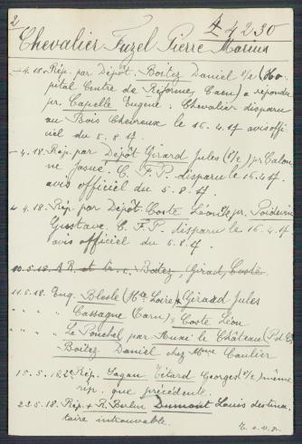 rappelé à la 13e SIM le 11/03/1915 ; passé à la 1ère SIM le 01/11/1915 ; passé à la 22e SIM le 01/01/1917 ; passé au 123e RI le 18/01/1917 ; passé au 8e RI le 23/03/1917
