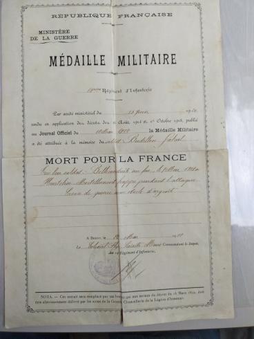 Citation(s) : "Très bon soldat. Belle conduite au feu, le 7 mai 1917 à Hurtebise. Mortellement frappé pendant l'attaque. Croix de guerre avec étoile d'argent"
