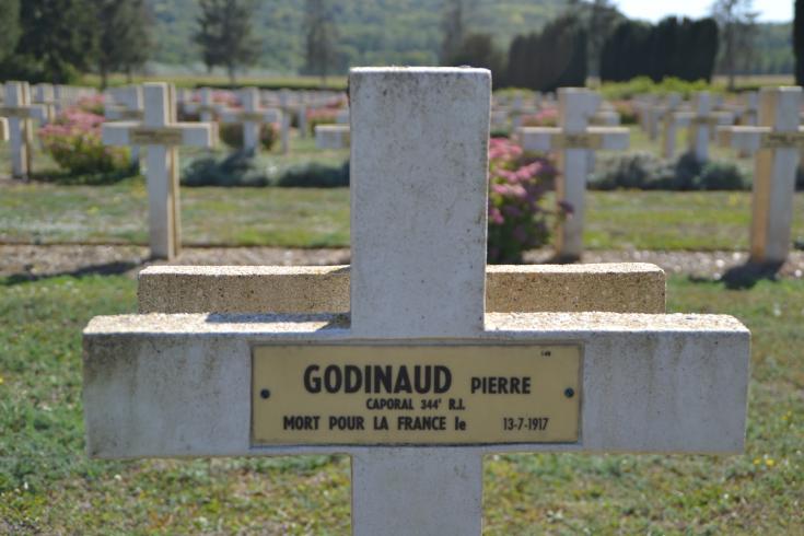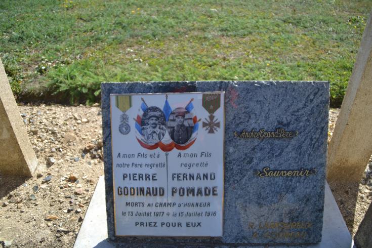 Informations complémentaires : Au cimetière de Saint-Sulpice-de-Faleyrens (Gironde), plaque tumulaire moderne "Hommage au Soldat Pierre GODINAUD Mort pour la France le 13 juillet 1917 à Longueval (Aisne) à l'âge de 39 ans.