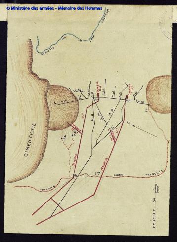 " explosion ennemie en avant de R. HG. Dégagement gazeux par R. GG. Ces gaz se sont enflammés quelques minutes après produisant une seconde explosion. Victimes : 19 morts de la 16/3 dont 14 retrouvés immédiatement."